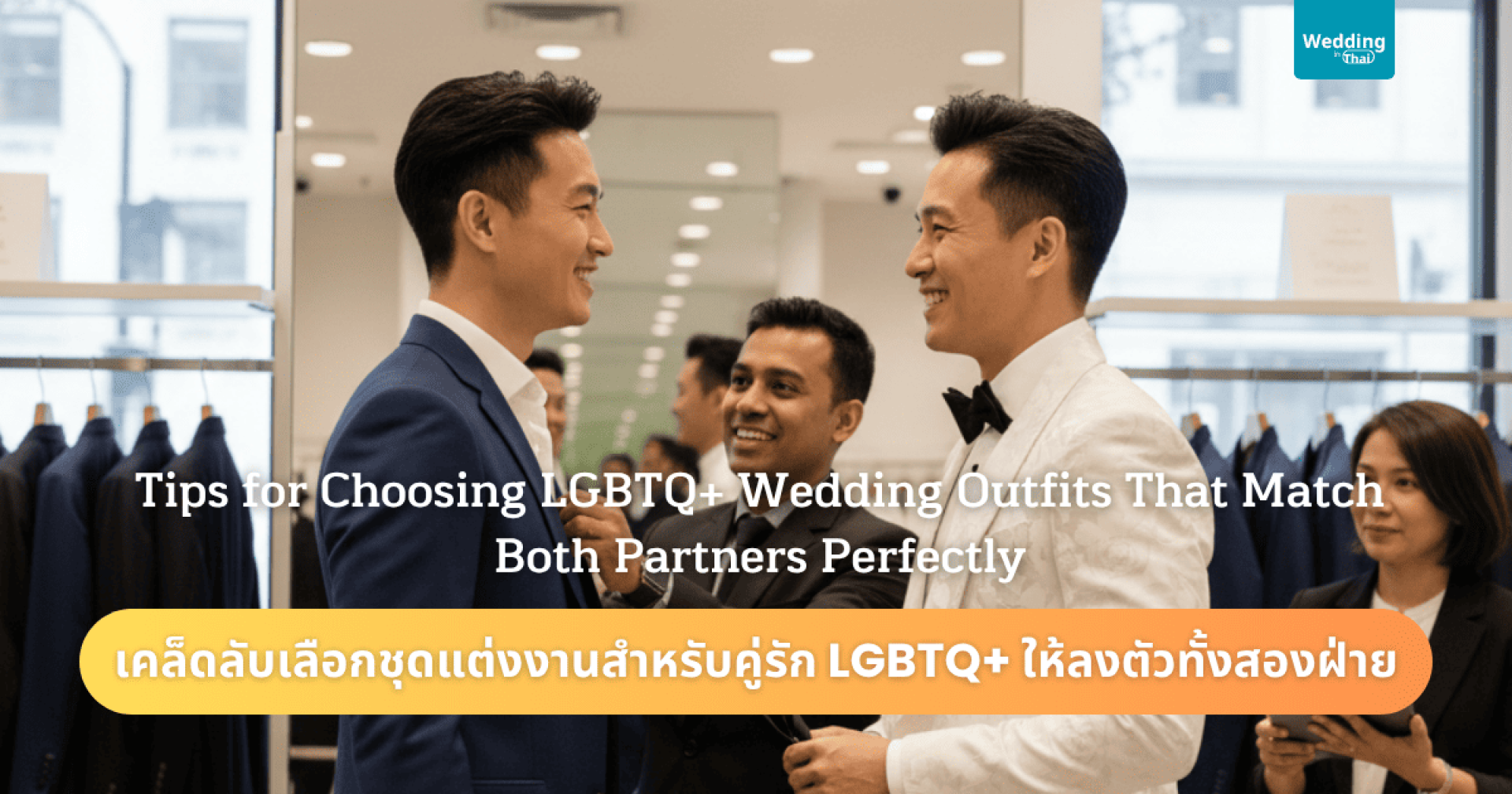 เวลามองหาชุดแต่งงาน หลายคู่มักเริ่มจากสไตล์ที่ตัวเองชอบก่อน แต่สำหรับคู่ LGBTQ+ การเลือกชุดยังเป็นเรื่องของ “บาลานซ์” และ “ความลงตัวร่วมกัน” เพราะงานนี้ไม่ได้มีกรอบเจ้าบ่าว-เจ้าสาวมาบังคับ แต่มีกติกาเดียวคือ ตัวตนของสองคนต้องชัด และความมั่นใจต้องเต็มเวทีในวันสำคัญ
